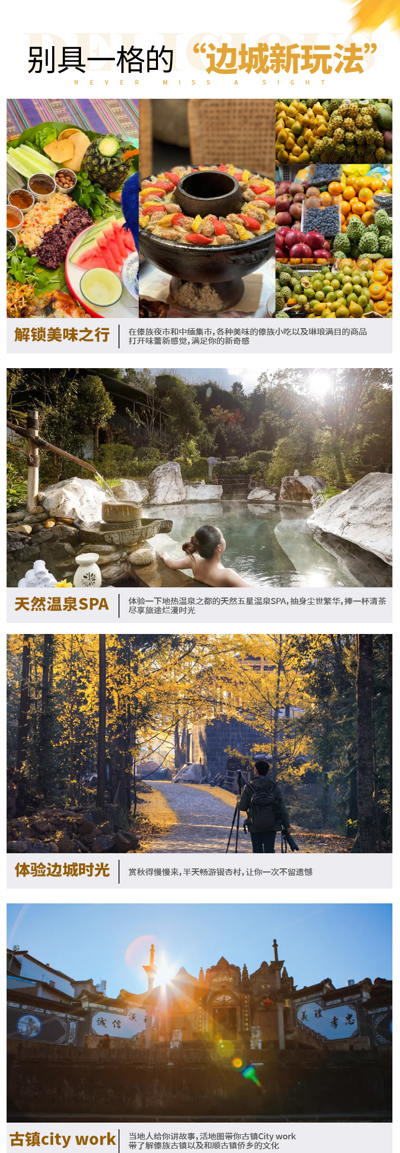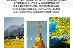 3、门票:行程内所列景点门票(芒市大金塔、大银塔、一寨两国、和顺古镇、热海景区含电瓶车、银杏村含电瓶车/高黎贡油菜花基地/火山景区3选1);