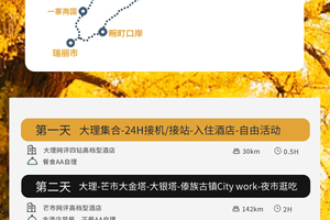 温馨提示:银杏黄叶季节为11月-12月中期,高黎贡油菜花季为2-3月份(两者因季节和天气变幻会有一点偏差),其它季节我们将以腾冲火山景区作为替代景点,敬请知悉。
