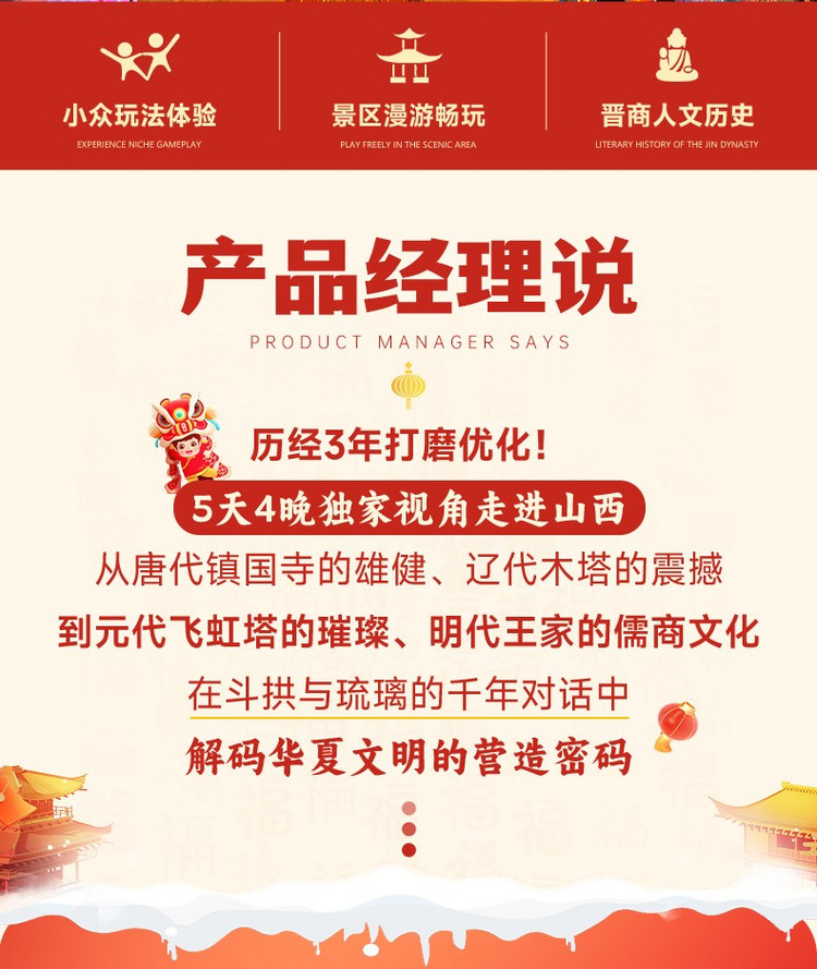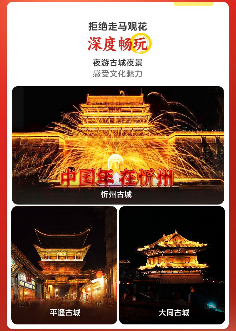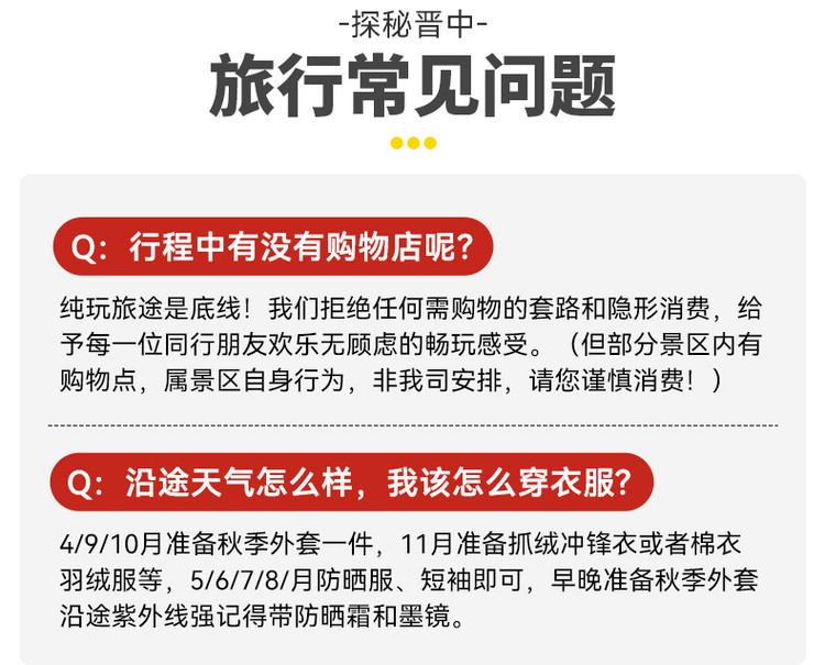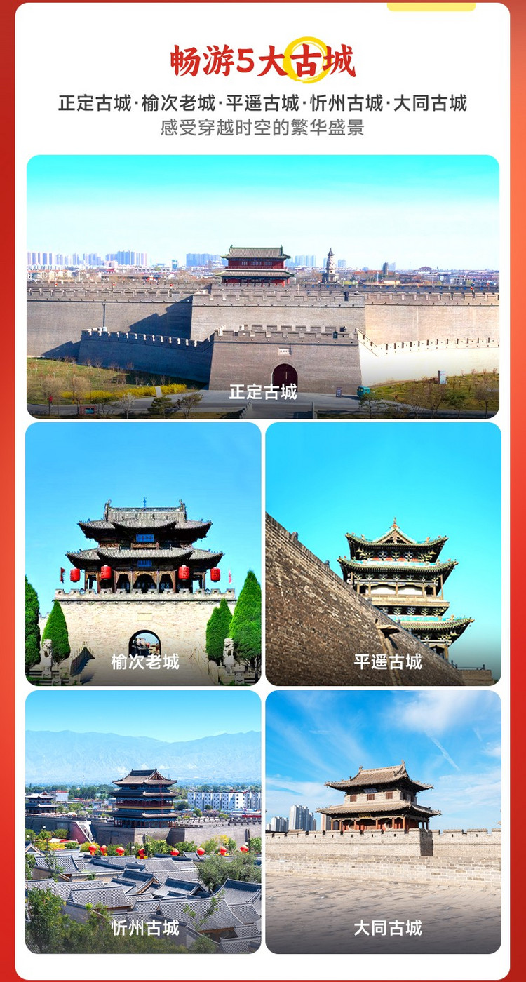 王家大院旺季55/淡季35、广胜寺飞虹塔70、镇国寺23、晋祠博物馆80元、应县木塔50元、云冈石窟淡季100元,行程内其他景区暂时未收取门票费,如临时产生多余门票费用自理,节假日门票请提前在各景区公众号实名制预约!