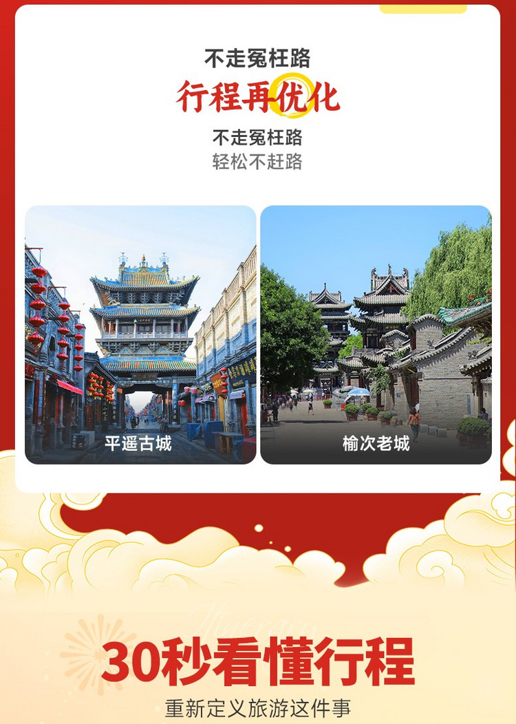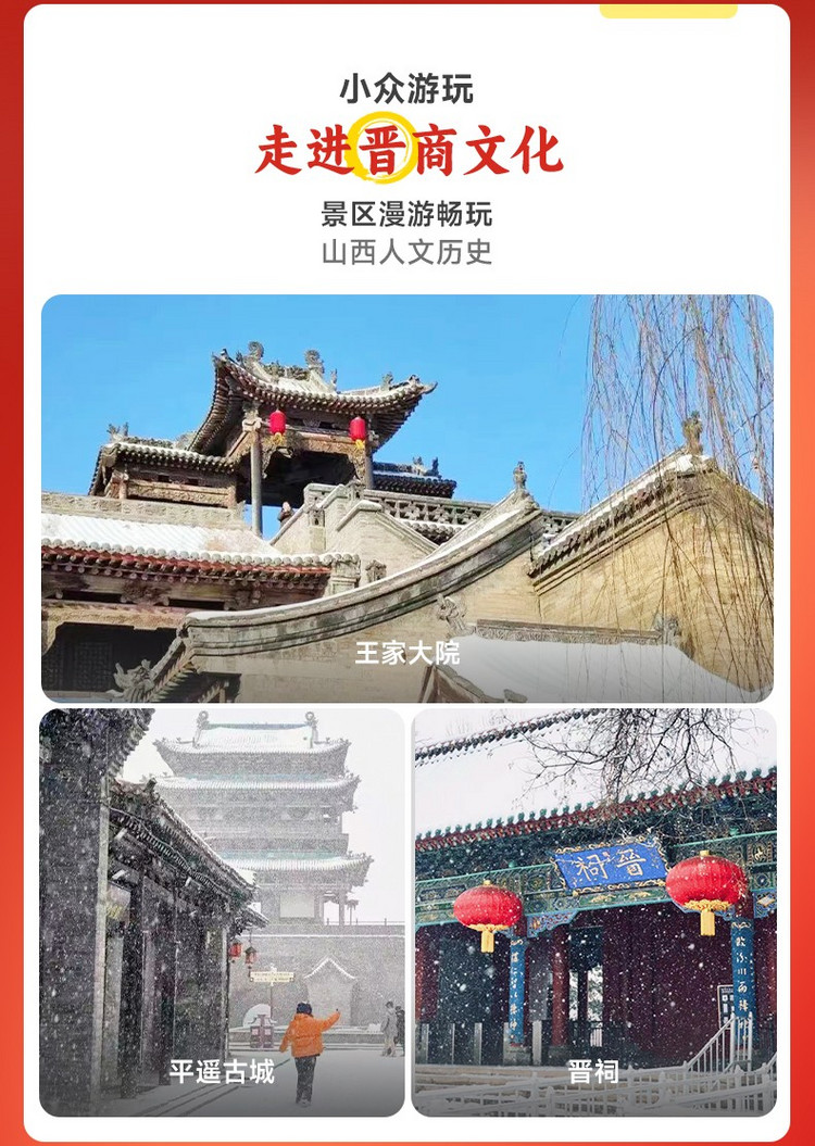·【平遥古城】这里是个放松心情的地方,体验平遥的古香古色吧!尽情品尝平遥内的美食:刀削面、猫耳朵、山棘果汁...让你体验山西舌尖上的味道! 可以登上古市楼看古城全景,亲手抚摸岁月拂过的痕迹,在静默中瞻仰其雄伟风姿。穿梭于古城的大街小巷,寻找你心中的平遥,了解古城的文化,了解平遥的历史。