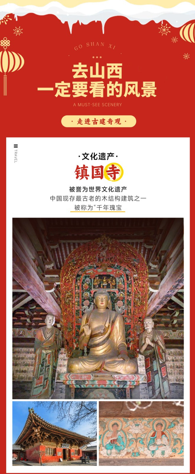 ·【镇国寺】始建于五代北汉年间,最初叫 “京城寺”,明嘉靖十九年(1540 年)改为 “镇国寺”。寺内建筑历经元、明、清等朝代多次修缮,基本形成今天的格局。总面积为 10892 平方米,分前后两个院落,在中轴线上,有天王殿、万佛殿、三佛楼等建筑,前院东西两侧有钟楼、鼓楼以及三灵侯、财福神、二郎、土地各殿堂,后院有罗汉殿、阎王殿等殿堂。