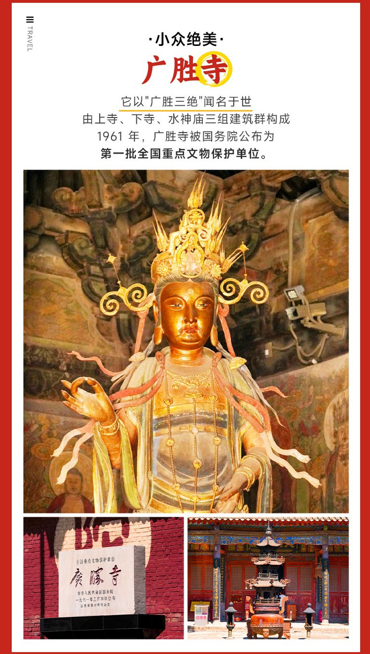 广胜寺以 “三绝一奇一特” 闻名天下,“三绝” 即水神庙元代壁画、佛教经书《赵城金藏》、飞虹宝塔;“一奇” 即唐代左右扭古柏;“一特” 即广胜寺建筑之奇特。1961 年,广胜寺被国务院公布为第一批全国重点文物保护单位。