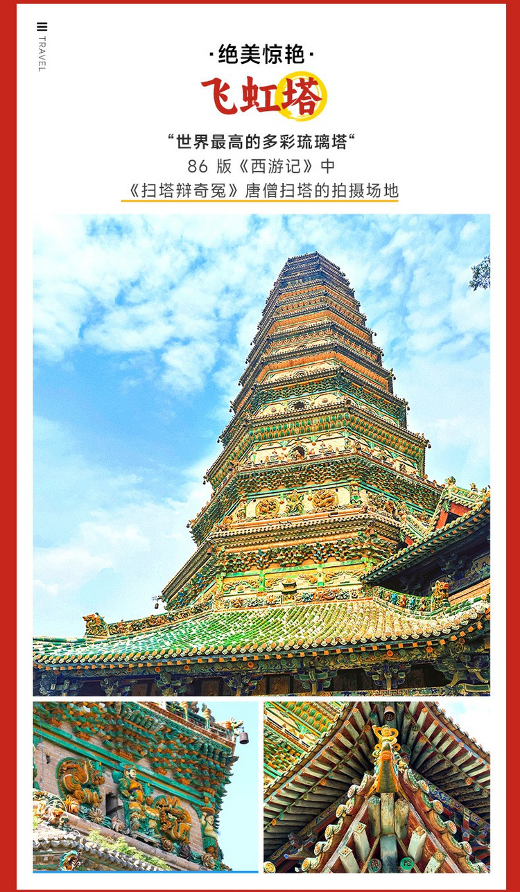 ·【飞虹塔】始建于东汉,其前身是阿育王塔,即佛祖舍利塔。世界吉尼斯纪录认证“世界最高的多彩琉璃塔”。整座塔身多采用黄、绿、蓝三彩琉璃,出檐处有斗拱、佛像、菩萨、金刚、花卉、盘龙等各种构建和图案,整座塔流光溢彩,华丽非凡,阳光下状若飞虹,故名飞虹塔。它还是 1986 版《西游记》十八集 “扫塔辨奇冤” 中祭赛国金光塔的取景地。