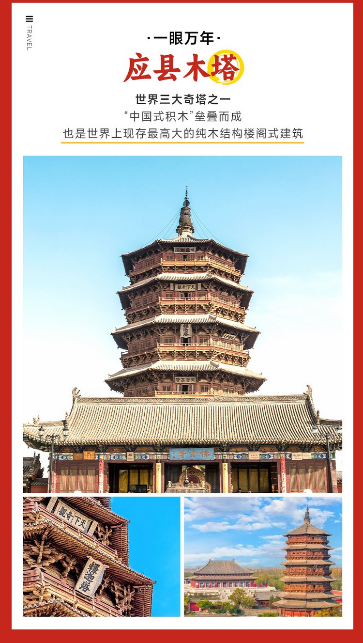 ·【应县木塔】与意大利比萨斜塔、巴黎埃菲尔铁塔并称“世界三大奇塔”的应县木塔,距今已经960余年,塔高67.31米,底层直径30.27米,呈平面八角形,全身纯木结构、无钉无铆,在经历了地震、战火、雷击后依然伫立在世人眼前的木塔,被梁思成称赞道“真是一个独一无二的伟大作品。不见此塔,不知木构的可能性到了什么程度!