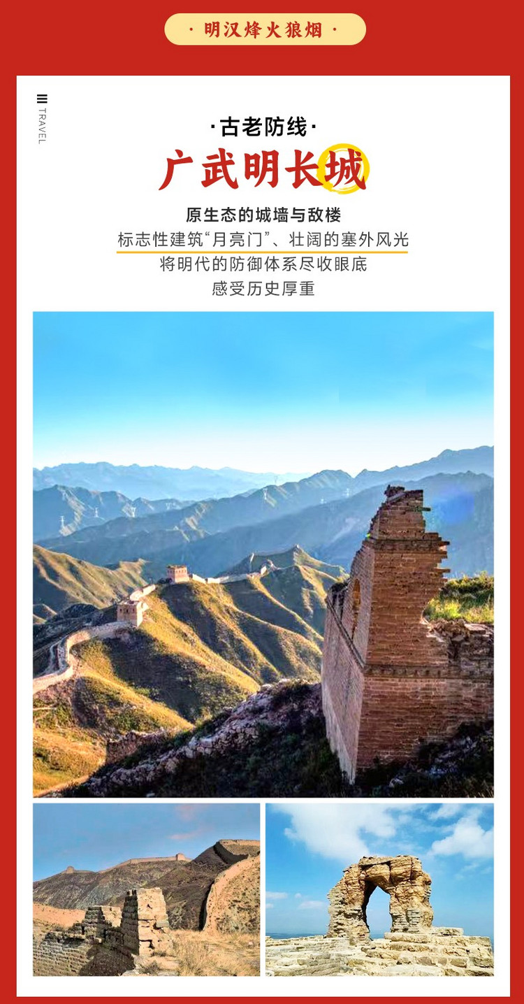 ·【广武明长城】是全国保存最完整的明长城之一。它宛如一条巨龙,蜿蜒于山脊之上,全长近 36 公里。漫步其间,你可以看到 20 座敌楼骑墙而建,与险要的地势互相映衬,尽显壁垒森严标志性景观 “月亮门”,虽已部分坍塌,但仍不失雄伟,仿佛在诉说着昔日的战火纷飞。沿着长城一号旅游公路自驾,窗外是连绵的山脉和古朴的城墙,边塞风光尽收眼底。