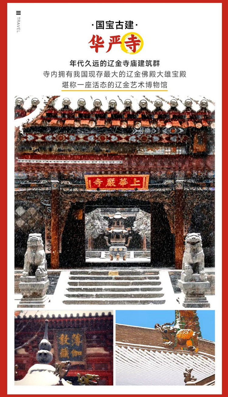 来华严寺,赏辽金建筑、观稀世彩塑,在千年古刹中感受历史与艺术的交融。
