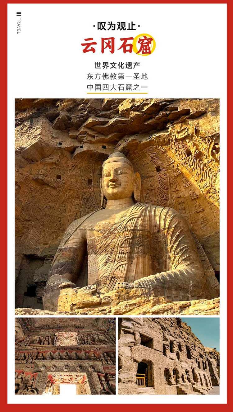 ·【云冈石窟】武州山麓的风,吹过 1500 年的时光,将北魏王朝的佛国传奇镌刻在石壁之上,这里便是云冈石窟,与敦煌莫高窟、洛阳龙门石窟和麦积山石窟并称为中国四大石窟。一部刻在山石上的北魏史诗。石窟规模宏大、窟内壁画精美绝伦、造像内容丰富,堪称中国佛教艺术的巅峰之作。