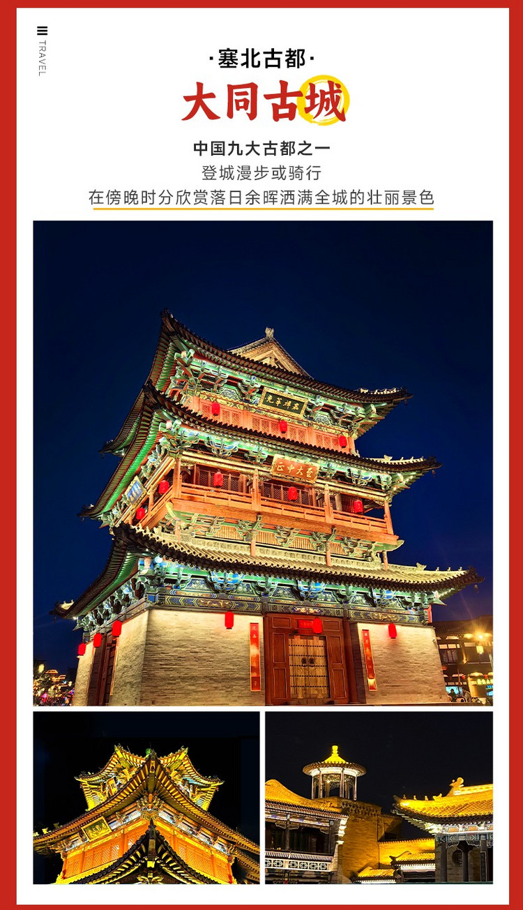 ·【大同古城】始建于宋朝,是我国古代军事建筑史上颇具特色的重镇名城,号称“金汤之城”。这里百步一寺,百步一庙,更有四牌楼、钟楼、鼓楼,四条大街、八条小巷、七十二条绵绵巷各具特色,还有多处古建筑和四合院,令人无限向往。特别是入夜时分,古城墙上华灯璀璨,城市主干道上条条灯河流光溢彩。整座城市笼罩在一片月色和灯光之中,让大同成了火树银花的不夜城,美不胜收,行走其间有一种童话般的感觉~