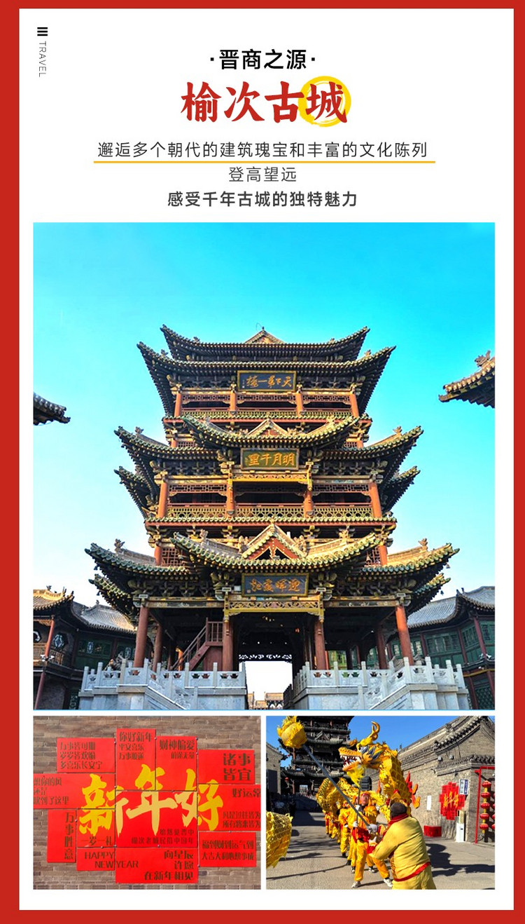 ·【榆次老城】穿越千年时光,邂逅古韵榆次。这座有着 1400 多年历史的活态古城,宛如一颗璀璨的明珠,镶嵌在三晋大地。这里集民居、古城墙、古县衙等人文景观与自然景观于一体,融晋商文化、民俗文化等多种文化为一炉。