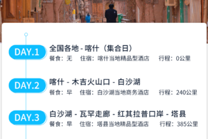 2.明天我们前往塔县的路上已逐渐步入高原,白沙湖及卡拉库里湖海拔大约在3800左右,途中多喝水多吃水果,缓慢行动,高原气温低风大,注意保暖避免感冒增加高反风险。