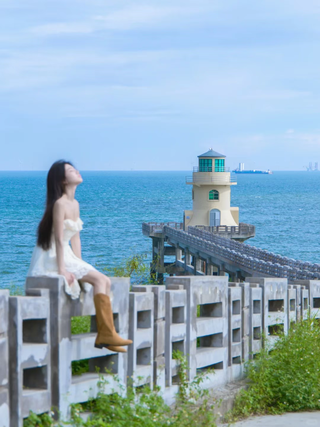 沿着海滨路向西,长山尾灯塔的红白配色与跨海大桥同框出镜,仿佛闯入了漫画世界。