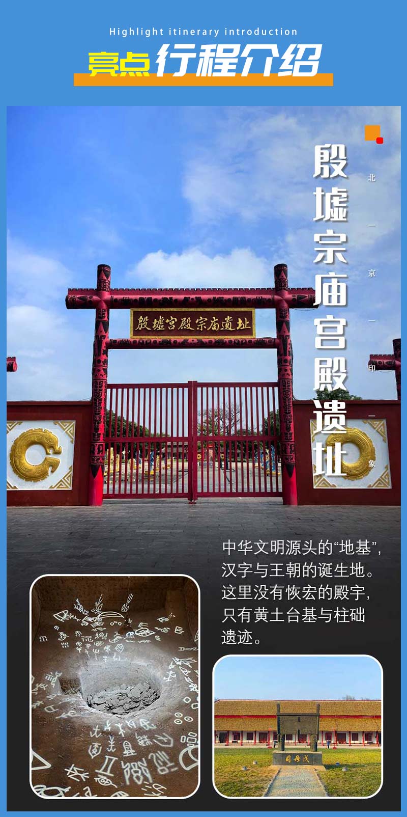 - 下午到达中华文明起源地,一个被列入有生之年必去清单的宝藏地安阳殷墟,感受古都千年之前的盛世繁华!首先我们游览【殷墟宗庙宫殿遗址】。