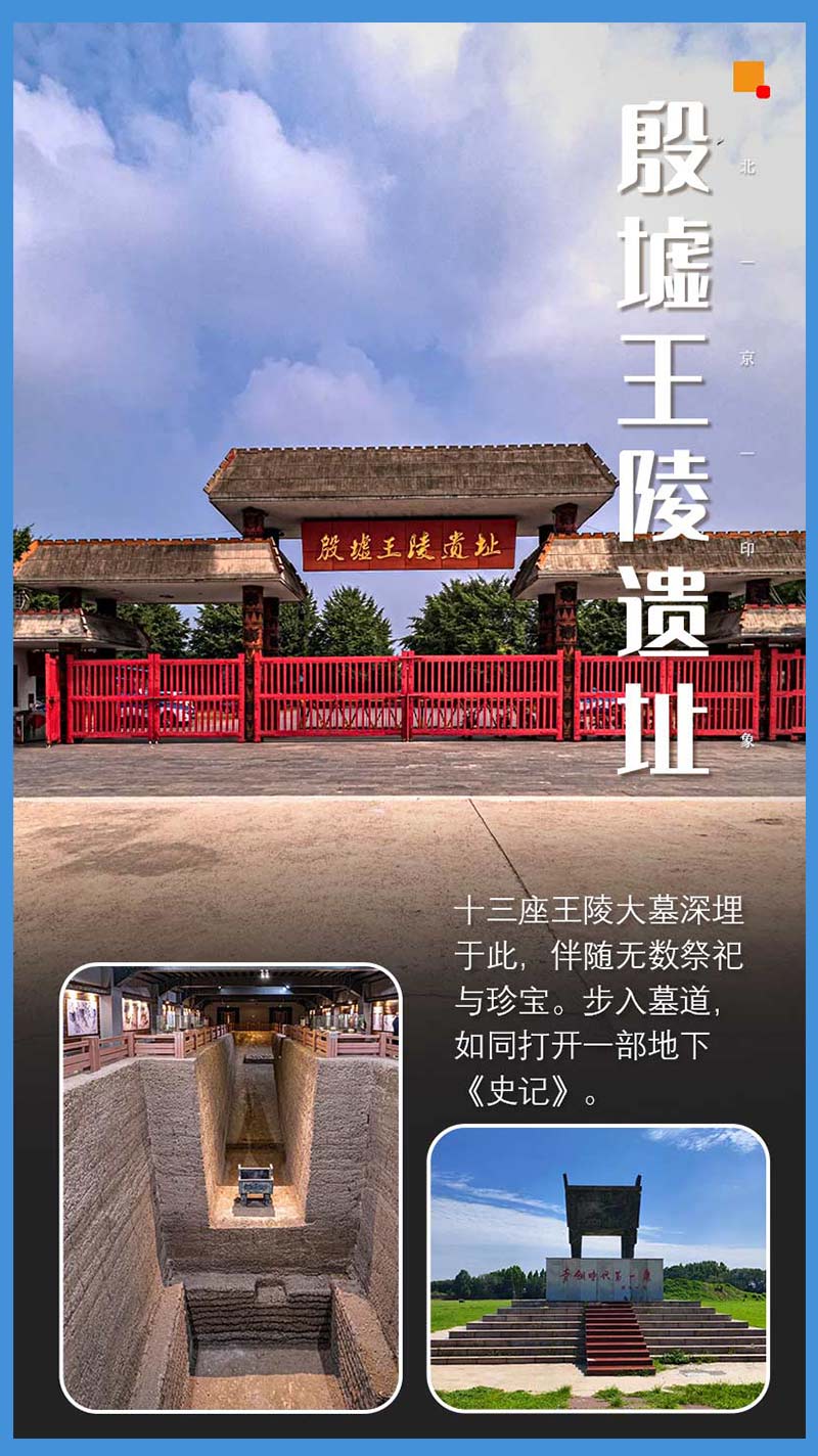 殷墟王陵遗址是世界文化遗产殷墟的重要组成部分,与殷墟宫殿宗庙遗址、洹北商城遗址等共同组成了殷墟遗址。建有M260大墓揭示展示和保护房工程、12座王陵大墓的植被标示以及480余座祭祀坑、兽祭坑展示工程等。殷墟王陵遗址已成为一座初具规模的集文物保护、科学研究、宣传教育和旅游休闲为一体的大型遗址公园。