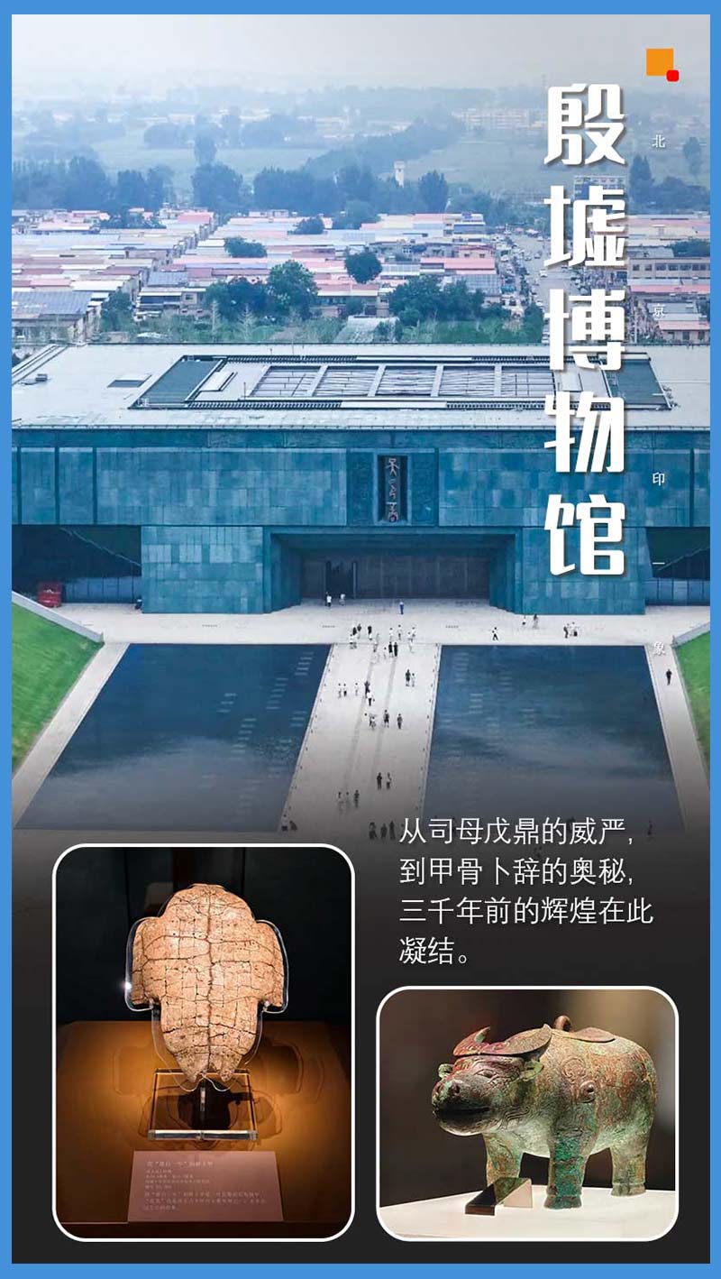 殷墟博物馆,是首个全景式展现商文明的国家重大考古专题博物馆。设8个展厅,地上共三层,是首个全景式展现商文明的国家重大专题博物馆,是黄河国家文化公园重点项目之一。 在展览布局方面,聚焦“伟大的商文明”这一主题,设有3个基本陈列、4个专题展览和1个特色沉浸式数字展,展出青铜器、陶器、玉器、甲骨等文物近 4000 件(套),展陈文物数量庞大、类型多样,其中四分之三以上的珍贵文物属于首次亮相,从商代史、甲骨学、考古史、商文明的世界传播等多个角度,全方位阐释商代繁盛的城市文明、完善的礼乐文明、发达的青铜文明、灿烂的文字文明以及高超的手工业技术等,生动呈现商文明对于中华文明乃至人类文明发展史上的重要地位和作用。在形式设计方面,以庄重、大气为基本遵循,广泛运用人工智能、多媒体等数字技术、裸眼3D技术,赋予文物、文献、甲骨记载等新的时代表达方式,提升全景式展现商文明的广度、深度、精度,构建文物、历史与数字虚拟空间交互场所。让人们多维度、立体化、沉浸式感受商文明传承和甲骨文魅力。