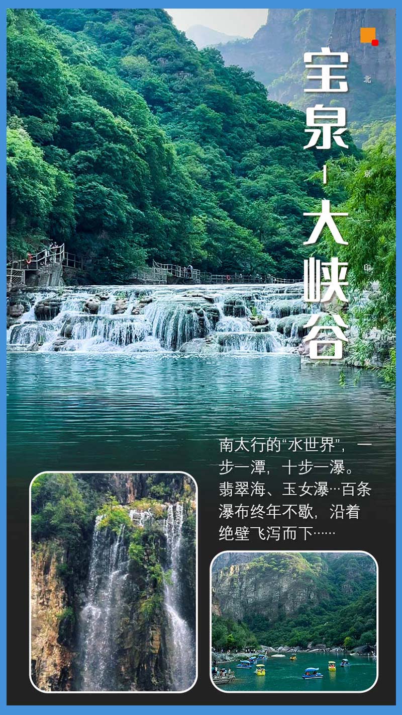 ​宝泉大峡谷,赤壁丹崖、沟壑纵横,宝泉湖水碧波荡漾、一望无际。区内特有嶂石岩陡崖断层地貌形成了太行山密集壮观的瀑布群,高峡平湖、潭瀑相连,秘境丛幽。双龙瀑、见龙瀑、玉女瀑、飞龙瀑、青苔瀑,五步一潭,十步一瀑,形态各异的瀑布组成的“中华千瀑谷”堪称太行奇观,被誉为“中原瀑布群”。