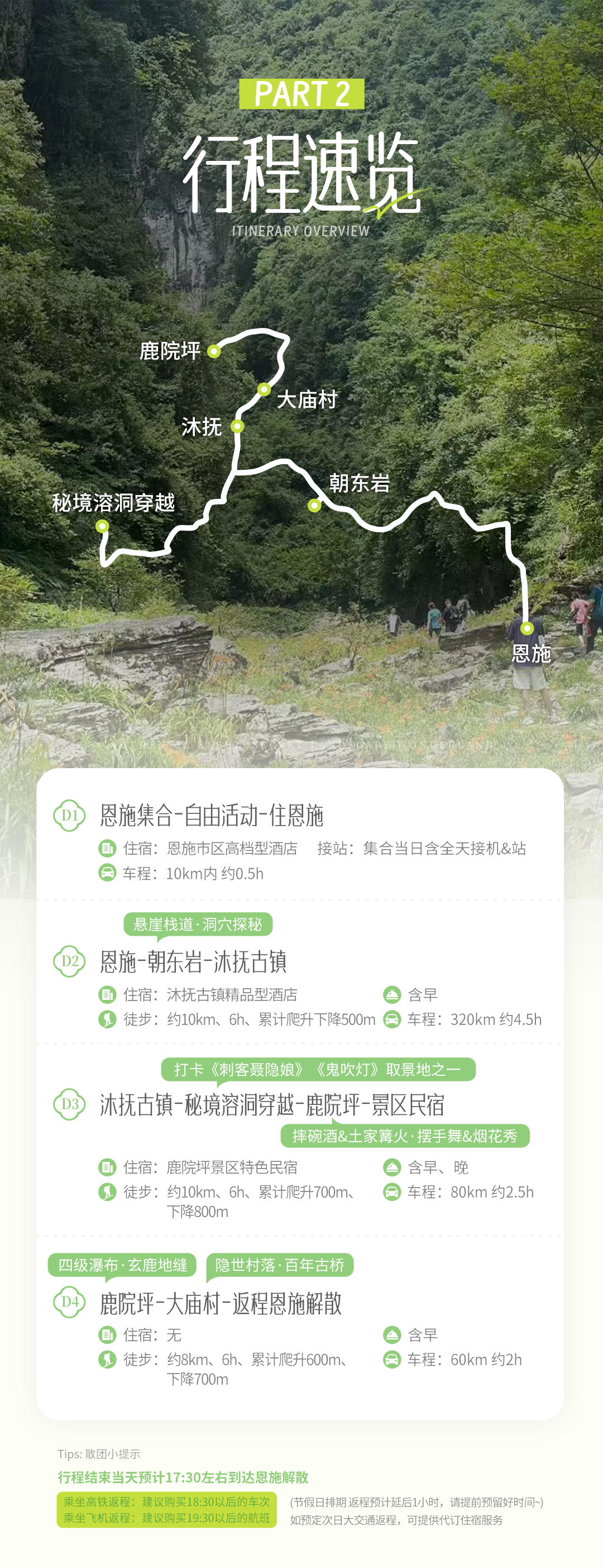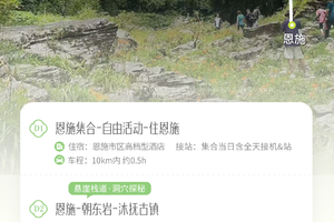 行程结束当天预计17:00左右到达恩施解散(建议返程时间:高铁18:00、航班19:00)
