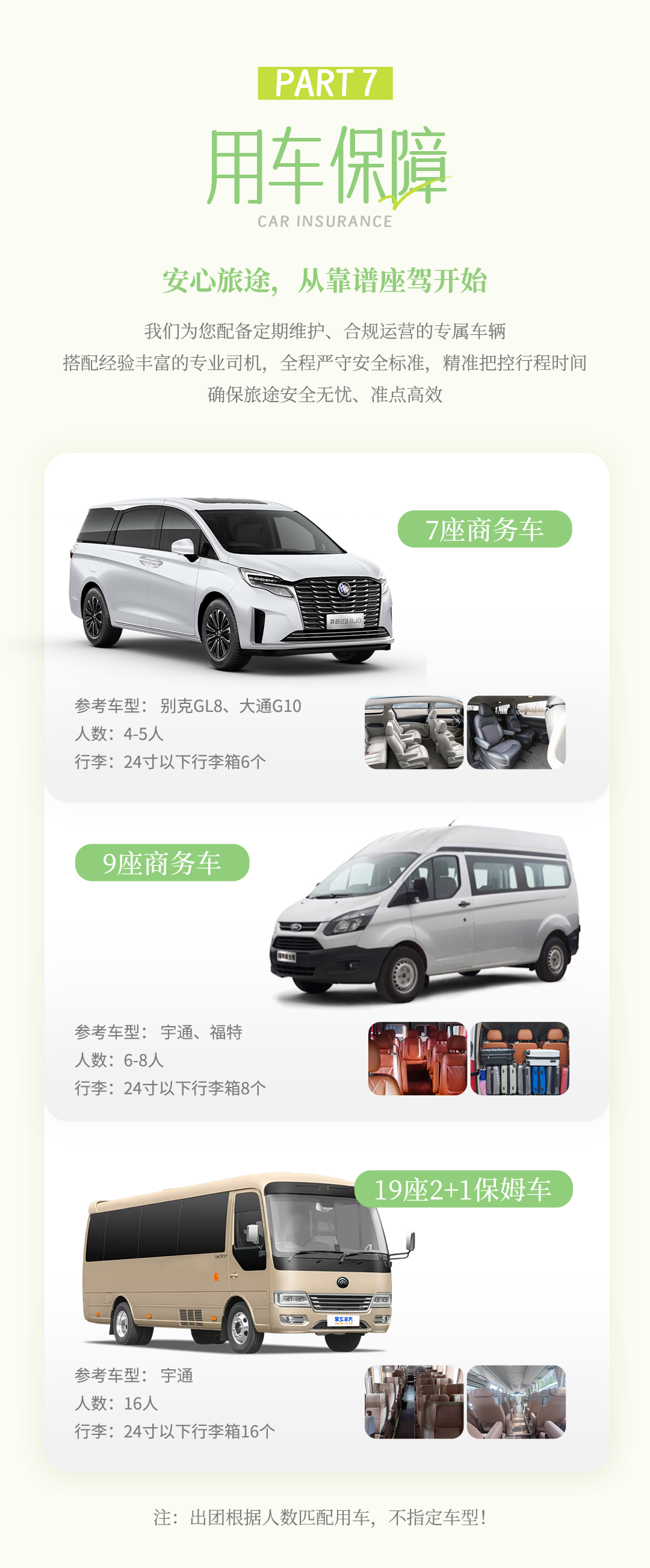 (3)座位:左手第一个座位为驾驶员,右手第一个座位为领队,其他为普通座位,上车后请自行选择座位,长途旅行,队员之间请互相谅解;