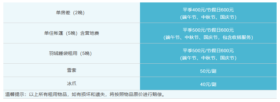 ● 驮运:包含所有装备驮运费用。(每人限重15KG,如超重每公斤200元,依次叠加)。