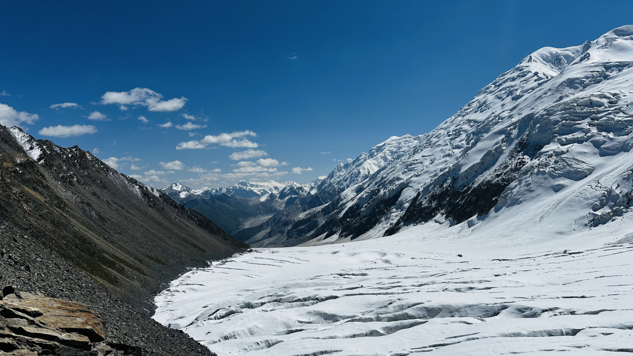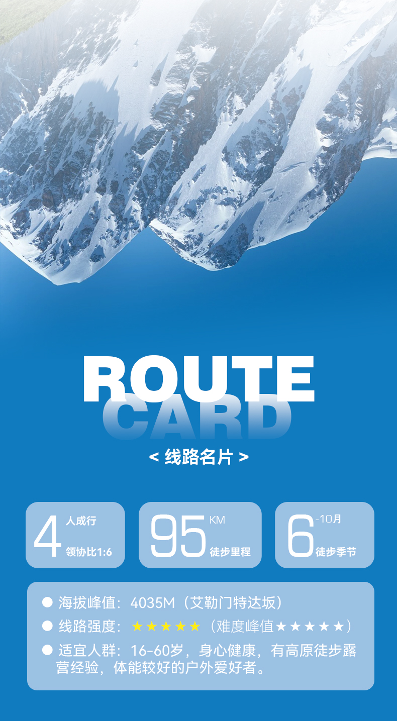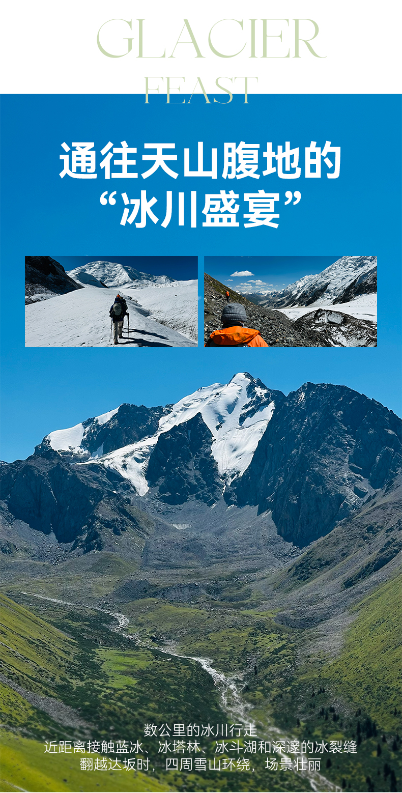 行程概览:今天是全程强度最大的一天,我们将踏上冰川之旅。早餐后出发,沿着河谷继续上行,直至冰川末端双湖。在双湖短暂休整,换上冰爪雪套,从这里开始冰川徒步,向着冰湖前进,最终挑战艾勒门特达坂。这一路的冰川景观如梦如幻,蓝色的冰体在阳光下闪耀着神秘的光芒,同时冰川上遍布冰裂缝,每一步都需要我们小心翼翼,但也让我们感受到了大自然的鬼斧神工。
