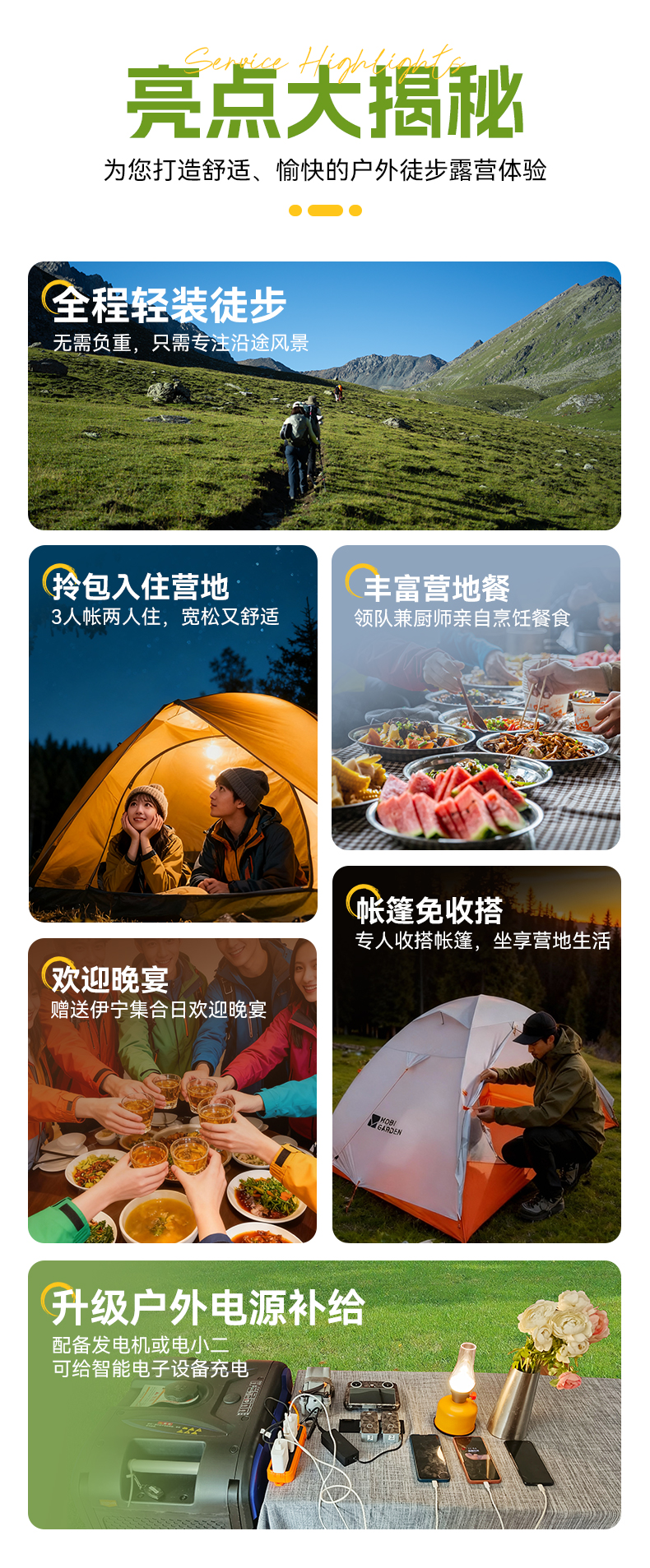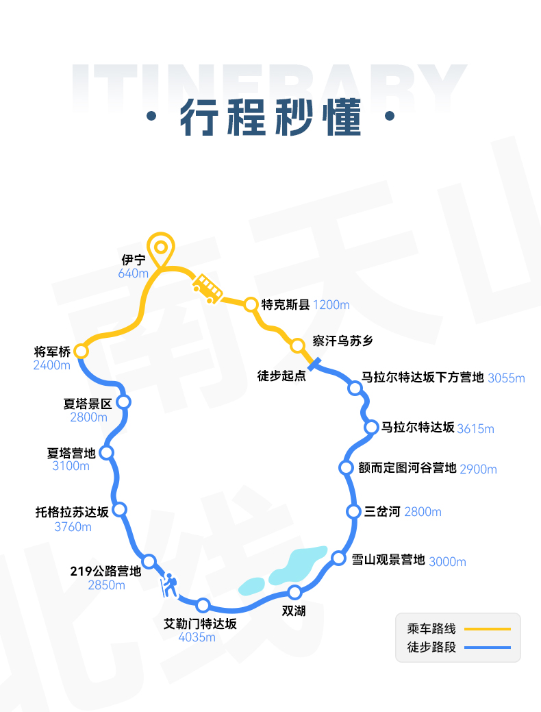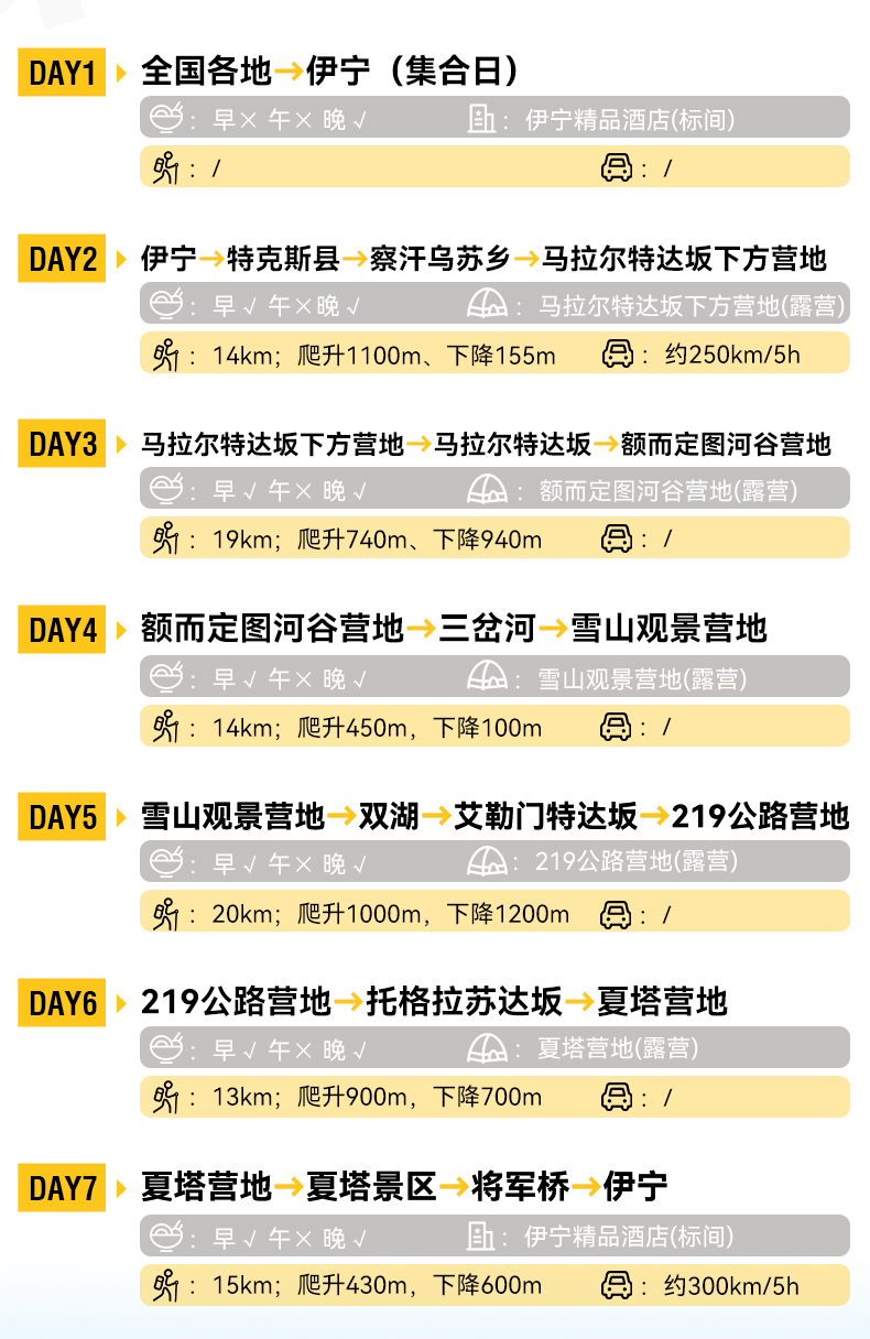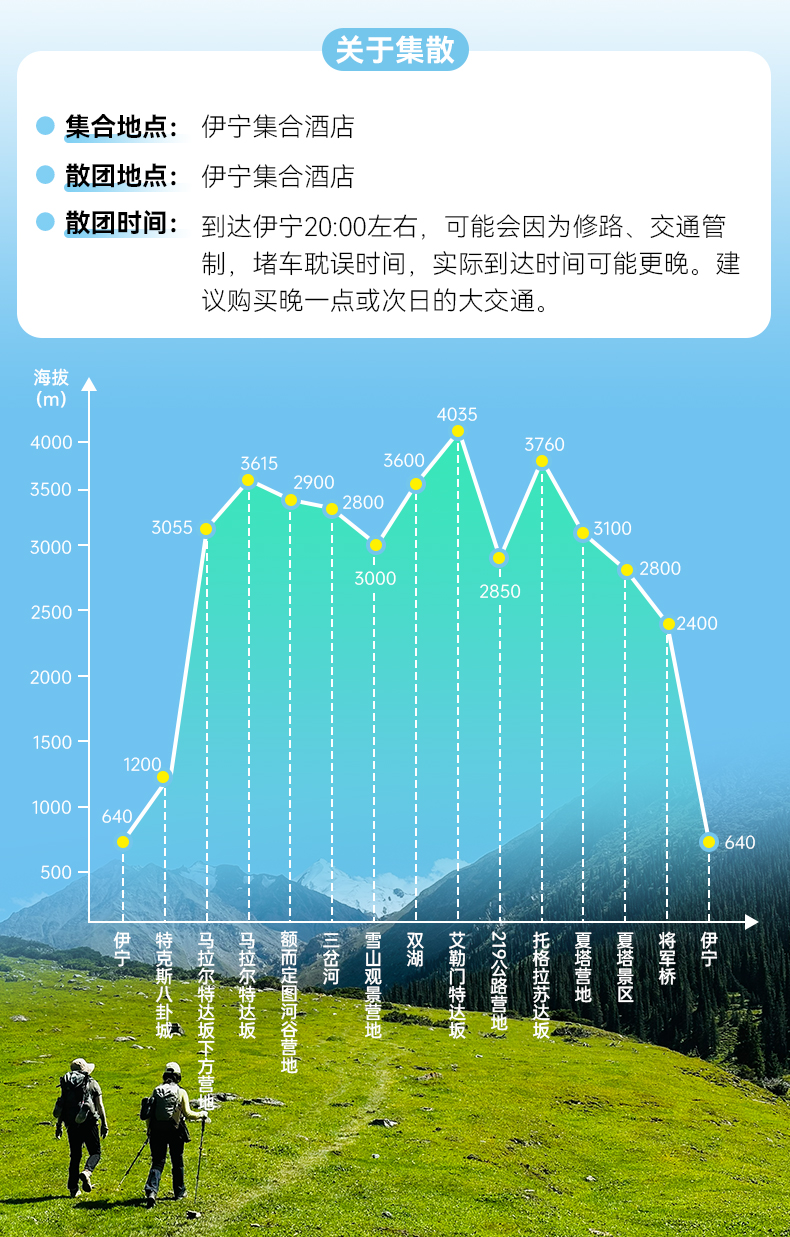 行程概览:今日出山,从营地出发一路平地+下坡,直至夏塔景区将军桥,在此换乘车辆返回伊宁市区,返回伊宁的时间约为20点左右,庆功宴按时间早晚安排在特克斯县或伊宁市,建议购买次日返程的大交通。