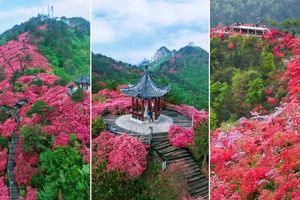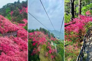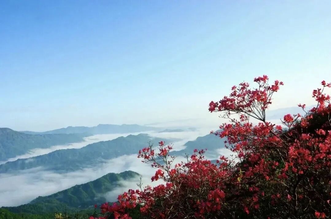 龟峰山巅,十里杜鹃织就烈焰红霞。万顷花海随峰峦起伏,似云锦倾泻人间。绯色波涛漫过青崖,晨雾中若隐若现的朱砂水墨,暮色里流光溢彩的珊瑚岛屿。千年古树缀满星子般的花苞,风过时簌簌抖落春的私语。这是大别山遗落的霓裳羽衣,每片花瓣都镌刻着时光的温度,让人恍若踏入羲和停轮的幻境,忘却尘寰。
