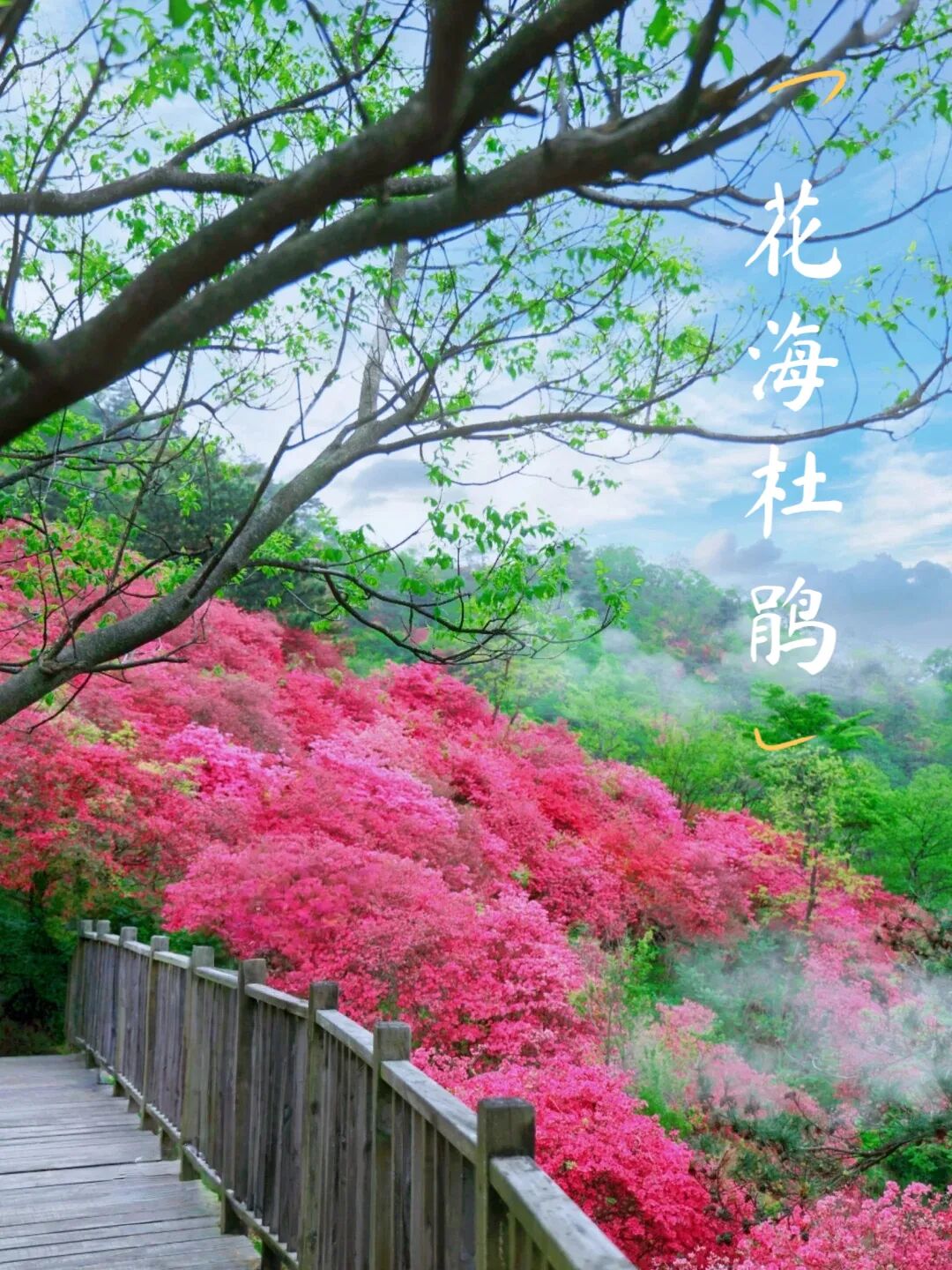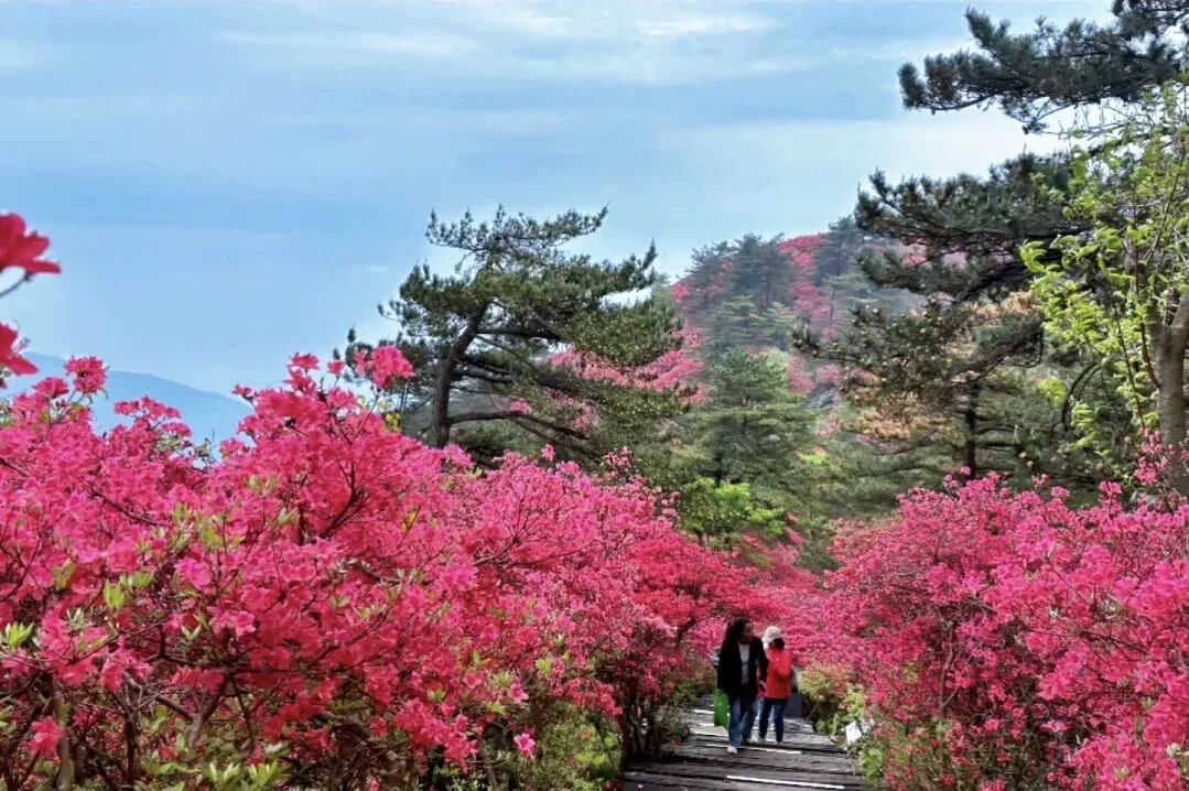 木质栈道蜿蜒山间,两侧杜鹃如火焰灼灼绽放