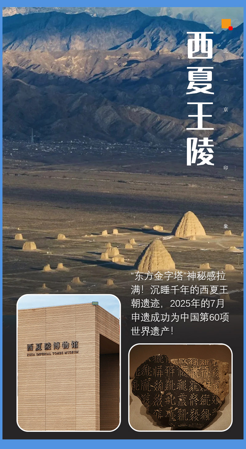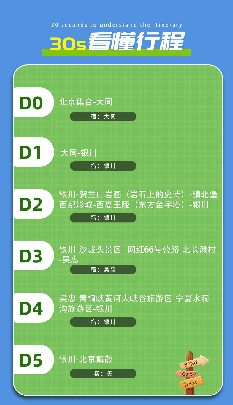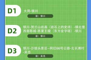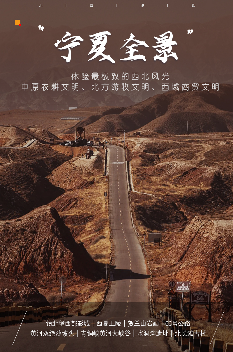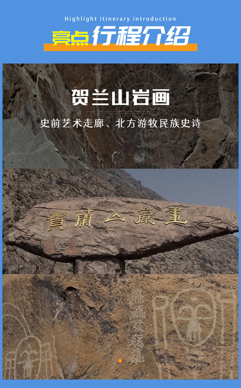 ▌ 行程概述 D0|北京集合-大同(宿) D1|大同-银川(宿) D2|银川-贺兰山岩画(岩石上的史诗)-镇北堡西部影城-西夏王陵(东方金字塔)-银川(宿) D3|银川-沙坡头景区--网红66号公路-北长滩村-吴忠(宿) D4|吴忠-青铜峡黄河大峡谷旅游区-宁夏水洞沟旅游区-银川(宿) D5|银川-北京解散