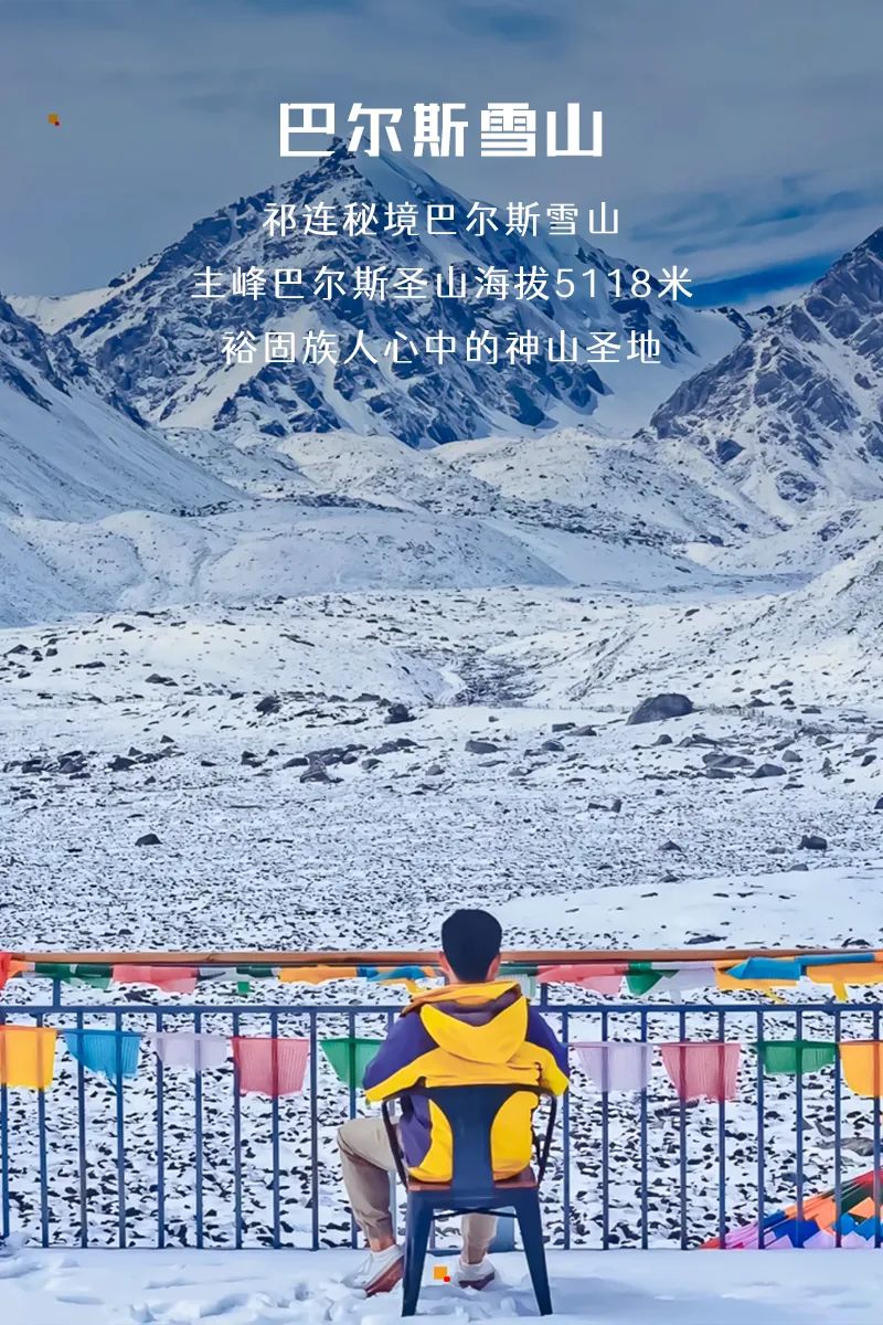巴尔斯圣山景区,主景区入口处海拔3900米,景区内东西分布着六座雪山,其中主峰巴尔斯圣山,海拔5118米,是裕固族人心中的神山圣地。这里的景致因其独特的高山地貌景观,原生态的自然风光和独有的裕固族文化,被誉为“东方阿尔卑斯”“自然体验胜地”。这里不仅有气势恢宏的冰川地质遗迹,壮丽神圣的雪山,还有辽阔的草原、五彩斑斓的森林和碧蓝通透的雪山天池,呈现出“雄、奇、秀、幽、旷”的自然美,独特的地貌人文景观、原生态的自然风光,被誉为“祁连山秘境”、“丝绸之路璀璨耀眼的明珠”。