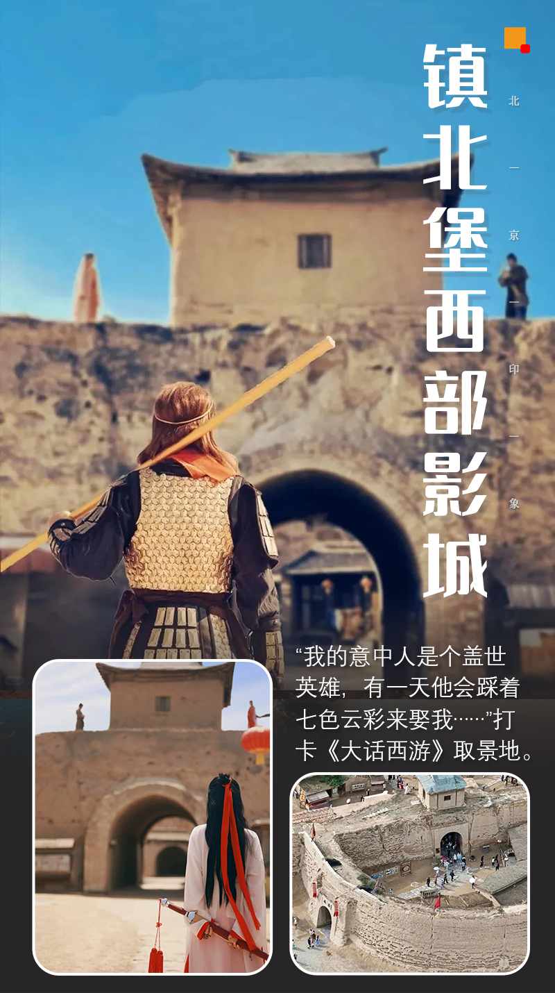- 早上继续出发,下午抵达银川【西部影视城】游览。这里是《大话西游》《红高粱》《龙门客栈》的取景地,黄土古堡与电影情怀碰撞出绝美的西北风情,分分钟拍出刷爆朋友圈的大片!建议游览线路:知之门→文化长廊→明城→老银川一条街→清城。每个景点都有其独特的魅力,如明城保留了众多影视作品的拍摄场景,老银川一条街则再现了20世纪50年代前银川市的风貌。